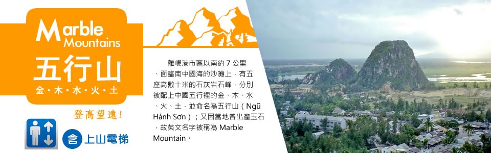【五行山】原為海中島,多少年的變遷成了陸地上的山。一開始名為五蘊山、五指山,位於峴港以東七公里處,西面有寒江,東面臨南中國海,在海邊平坦的沙灘上,金、木、水,火、土五座山峰(其中火山為雙峰)拔地而起,氣勢雄偉。由於風光秀麗。古人有詩寫道:「何處景色勝五行,不遜仙境是蓬萊。山光彩石峰浴翠,古寺香霧繞雲岩。」五山之中以水山最美最大,水山位於東北方,海拔一百零八米,山上有靈應寺、華嚴雲洞、華嚴石洞,靈岩洞、陵虛洞、雲通洞、藏珠洞、雲月洞及天龍洞等。洞窟安置有佛像,常有信徒前來膜拜。據說五行山頗具靈氣,而且有許多神秘洞穴,因而成為當地居民供奉神祇之地,也可說是這個地區的宗教聖地,吸引遊客、信徒絡繹不絕。如今寧靜和美麗又重新回到越南的土地上,越南的中部不僅僅是美麗自然景觀,更多的是還有一種生活體驗,還有一種人文歷史的懷想。