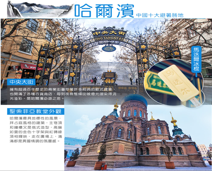 【中央大街】全長1,450公尺的步行街,呈現東北特有的人文風情,可媲美法國香謝大道且為東北最繁華商業中心的這是一條全部由十三條街道組成,地上皆由花崗方石板鋪成,是條只能允許行人行走車輛禁行的步行街,沿街多為俄式風格建築。中央大街是哈爾濱的縮影,哈爾濱的獨特建築文化和哈爾濱人的歐式生活,這裏都有明顯的體現。
