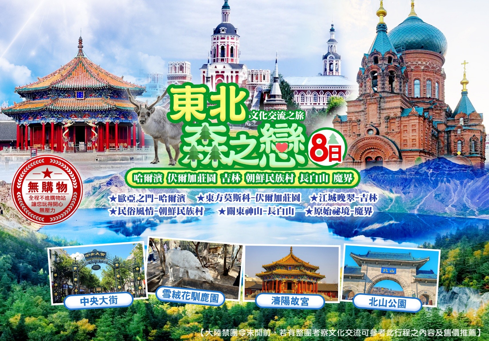 哈爾濱→0.5H伏爾加【伏爾加莊園(尼古拉教堂、普希金沙龍、小白樺餐廳、巴浦洛夫城堡、三只熊樂園、彼得洛夫藝術宮、獨角獸森林馬場)】→ 3H吉林【車遊松江中路、天主教堂外觀、臨江門大橋夜景】