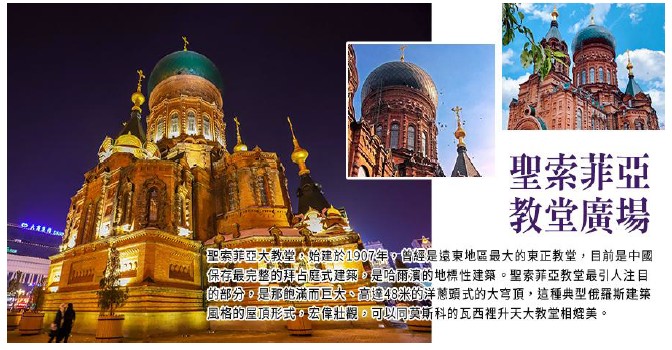 【聖索菲亞教堂廣場 ( 外觀 ) 】是遠東地區最大的東正教堂,是拜占庭式建築的典型代表。1996年11月,被列為全國重點文物保護單位。巍峨壯美的聖索菲亞教堂,構成了哈爾濱獨具異國情調的人文景觀和城市風情,同時,它又是沙俄入侵東北的歷史見証和研究哈爾濱市近代歷史的重要珍跡。