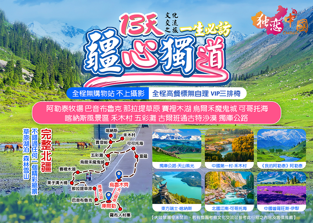 1. 您不可不知,北疆旅遊必去喀納斯、禾木、賽里木湖、喀拉峻草原 或是 那拉提草原、等重要景點!! 做為中國面積最大省份的新疆(166萬平方公里,約為台灣43倍大),幅員遼闊,飛機往返烏魯木齊需要2天時間,出發一天,返程一天,想要不錯過精彩絕景真正瞭解新疆的美,一般需要在新疆安排住宿10-11晚以上,才能好好感悟新疆的美好。本行程有別於一般市場上可能受限天數/團費任意刪減必去的地方,完整的安排遊覽到北疆最重要的景點,不惜成本一定要讓迷戀旅遊的貴賓們,不錯過任何一個精彩絕景。雖因此多負擔旅遊費用,使迷戀旅遊的產品售價更提高,但絕對會是您前往新疆旅遊的最佳選擇,畢竟都花了高價的團費就不該錯過任何一個精彩且必去的景點!!